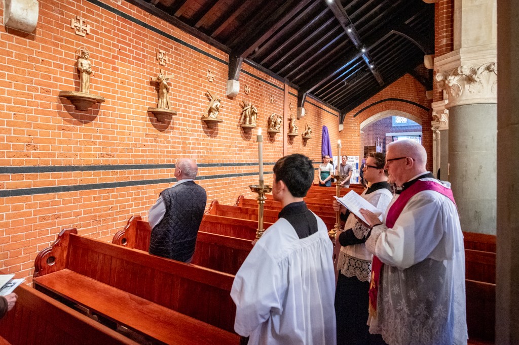 Christ above in torment hangs;
